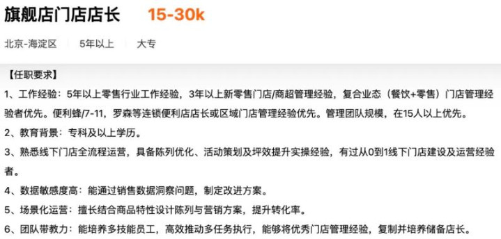 业务变化方面,公司新近发布的一则招聘启事称,将以1.5万元至3万元薪资招聘北京首家旗舰店的店长,优先聘用有“餐饮+零售”复合业态管理经验的人才。